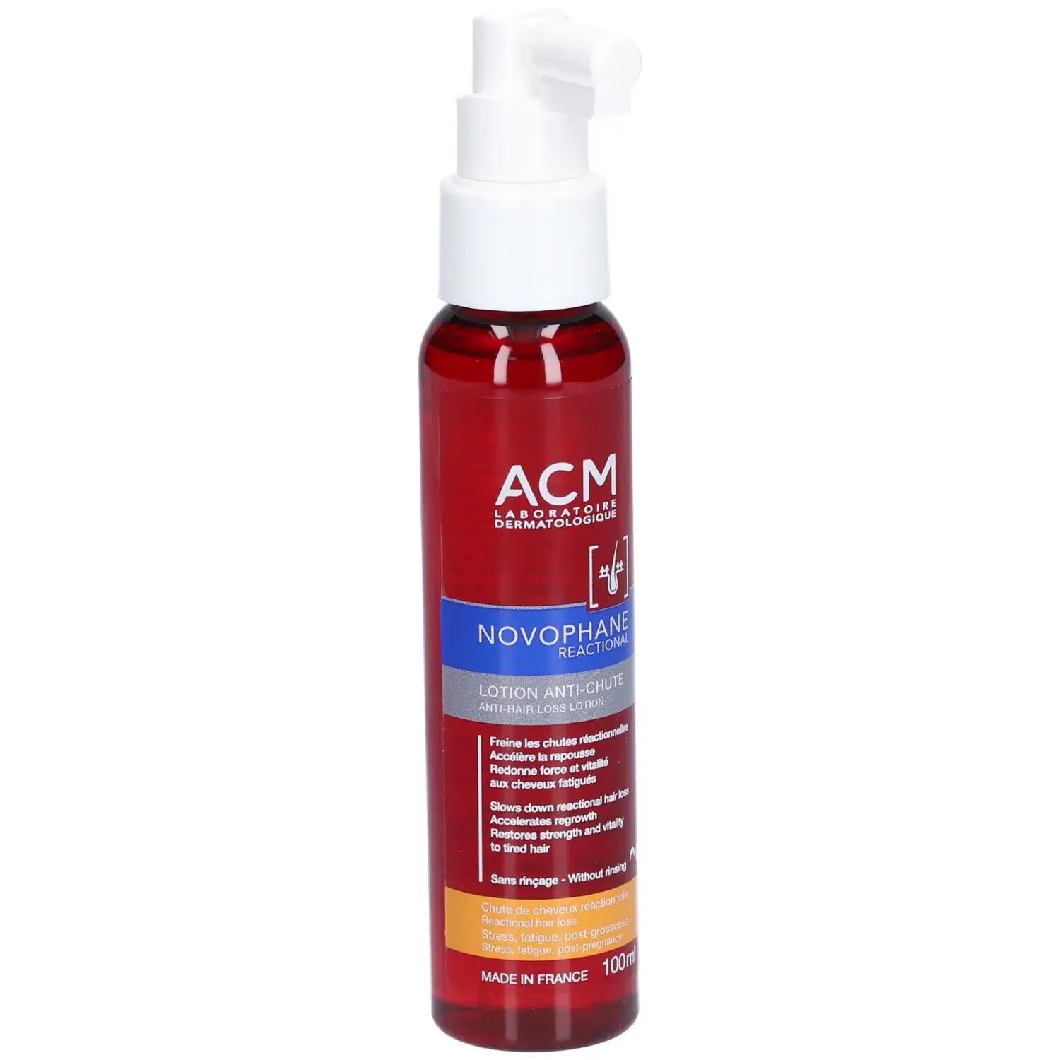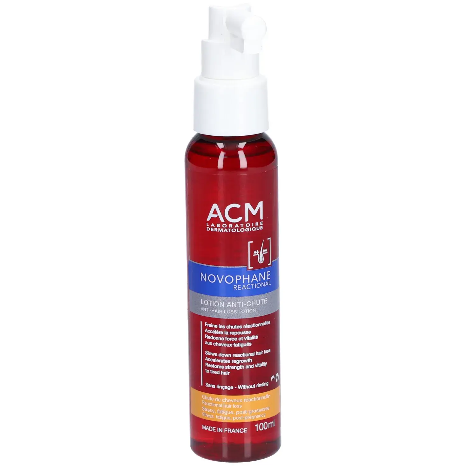 La lotion réactionnelle anti-chute Novophane d’ACM est votre alliée au quotidien pour lutter efficacement contre la chute de cheveux passagère. Grâce à sa formule innovante, elle agit directement à la racine pour freiner la perte de cheveux et stimuler la croissance capillaire. Enrichie en actifs fortifiants et revitalisants, cette lotion redonne vigueur, densité et éclat à votre chevelure. Sa texture légère et non grasse pénètre rapidement sans alourdir ni laisser de résidus. Utilisée régulièrement, elle favorise une chevelure plus résistante face aux agressions extérieures et au stress. Le format 100ml est idéal pour une cure d’un mois, s’intégrant facilement à votre routine capillaire. Convient à tous types de cheveux, même les cuirs chevelus sensibles. Appliquez une à deux fois par jour sur cuir chevelu sec ou humide, en massant délicatement pour une meilleure absorption. Non parfumée, elle respecte l’équilibre naturel du cuir chevelu. Adoptez Novophane Lotion Réactionnelle pour retrouver des cheveux forts, denses et en pleine santé.
