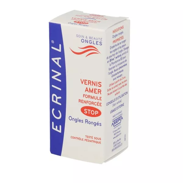Découvrez ASEPTA ECRINAL Ongles Vernis Amer 10ml, la solution experte pour lutter efficacement contre l’habitude de se ronger les ongles. Sa formule innovante, à base d’agents amers spécifiques, dissuade instantanément de porter les doigts à la bouche. Transparent et discret, il convient aussi bien aux adultes qu’aux enfants et s’applique en toute simplicité sur ongles naturels ou vernis. Enrichi en actifs protecteurs, il contribue à renforcer et à protéger les ongles au quotidien. Son pinceau précis garantit une application homogène pour une efficacité optimale. Ce vernis participe à la repousse saine des ongles tout en limitant les agressions extérieures. Idéal en période de stress ou pour accompagner le sevrage des mauvaises habitudes, il offre une aide précieuse et visible dès les premiers jours. Pour de meilleurs résultats, appliquez une couche fine chaque jour sur des ongles propres et secs. Renouvelez l’application après chaque lavage des mains. Avec ASEPTA ECRINAL, retrouvez des ongles beaux, forts et protégés en toute sérénité.