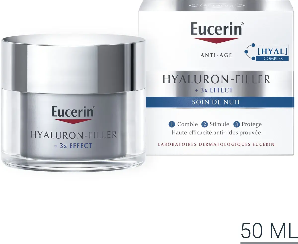 EUCERIN HYALURON-FILLER Soin de Nuit 50ml est un soin visage anti-âge innovant, spécialement conçu pour lisser les rides et raffermir la peau pendant votre sommeil. Sa formule associe deux types d’acide hyaluronique pour combler les rides, même profondes, en surface et en profondeur. Enrichi en saponine bio-active, ce soin stimule la production naturelle d’acide hyaluronique et favorise la régénération cellulaire nocturne. Sa texture onctueuse pénètre rapidement, laissant la peau douce, hydratée et parfaitement nourrie. Nuit après nuit, les traits sont reposés, le teint plus lumineux et la peau visiblement plus jeune. Convient à tous les types de peaux, même sensibles. Hypoallergénique et non comédogène, il s’intègre parfaitement à votre routine beauté quotidienne. Appliquez chaque soir sur une peau nette, en massant délicatement le visage, le cou et le décolleté. Pour des résultats optimaux, utilisez en complément le soin de jour de la même gamme. Offrez à votre peau un soin expert pour une beauté renouvelée au réveil.