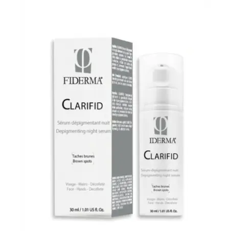 FIDERMA CLARIFID SÉRUM DÉPIGMENTANT NUIT 30ML est le soin expert incontournable pour atténuer visiblement les taches pigmentaires et unifier le teint. Sa formule innovante associe des actifs dépigmentants puissants pour agir en profondeur pendant la nuit, période clé du renouvellement cellulaire. Adapté à tous les types de peau, ce sérum cible efficacement les taches brunes, les marques d’acné et les irrégularités pigmentaires, pour une peau sublimée au réveil. Sa texture légère et non grasse pénètre rapidement, sans laisser de film collant. Utilisé régulièrement, il révèle progressivement un teint lumineux, uniforme et éclatant de santé. Enrichi en ingrédients apaisants, il respecte l’équilibre cutané et convient même aux peaux sensibles. Pour un résultat optimal, appliquez chaque soir quelques gouttes sur une peau propre, en insistant sur les zones concernées, puis poursuivez avec votre soin hydratant habituel. Grâce à sa présentation pratique de 30 ml, il s’intègre facilement dans votre routine beauté nocturne. Offrez à votre visage une action ciblée durant la nuit et retrouvez une peau visiblement plus belle, jour après jour.