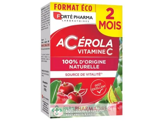 Découvrez FORTE PH Acérola, le complément alimentaire idéal pour renforcer votre vitalité au quotidien. Chaque comprimé est formulé à base d’acérola, une source naturelle de vitamine C reconnue pour soutenir le système immunitaire et réduire la fatigue. Sa composition de haute qualité permet une assimilation optimale, pour des effets rapides et durables. Pratique, le format 60 comprimés vous accompagne durant deux mois pour un apport régulier en nutriments essentiels. FORTE PH Acérola convient à toute la famille, notamment en période de stress, de changements de saison ou d’activité intense. Sa formule naturelle respecte votre bien-être et s’intègre facilement à votre routine quotidienne. Prendre 1 à 2 comprimés par jour, de préférence le matin, avec un grand verre d’eau. Ce complément est particulièrement recommandé en prévention des coups de fatigue ou pour soutenir vos défenses naturelles. Faites confiance à FORTE PH pour une qualité irréprochable et des résultats visibles. Optez pour la vitalité naturelle de l’acérola et retrouvez énergie et dynamisme jour après jour.