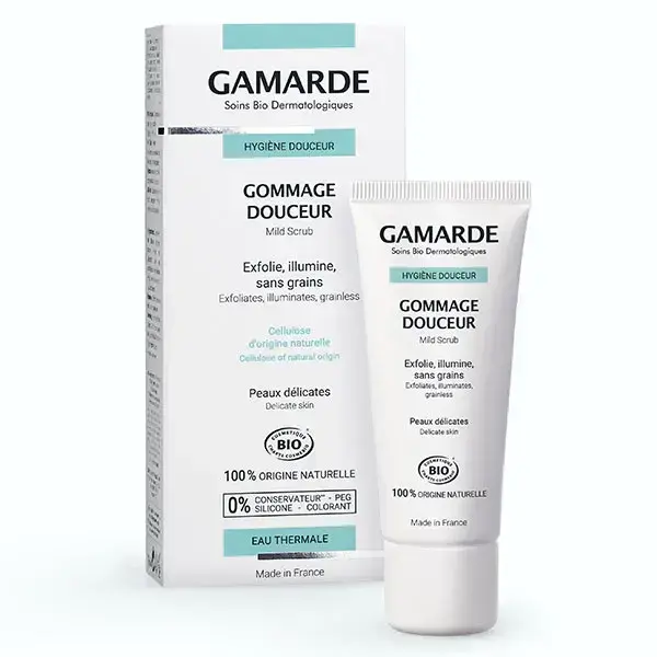 Le Gommage Douceur Visage Gamarde offre une exfoliation délicate, idéale pour les peaux sensibles. Grâce à sa formule naturelle certifiée bio, il élimine en douceur impuretés et cellules mortes sans agresser l’épiderme. Enrichi en eau thermale de Gamarde-les-Bains et en huiles végétales, il apaise, hydrate et protège la peau tout au long du soin. Sa texture crémeuse, agrémentée de fines particules exfoliantes, affine le grain de peau et ravive l’éclat du teint. Utilisé régulièrement, il laisse la peau lisse, douce et lumineuse, prête à recevoir les soins complémentaires. Hypoallergénique, il convient parfaitement aux peaux réactives ou délicates. Ce gommage s’intègre facilement dans votre routine beauté hebdomadaire. Appliquez une noisette sur le visage préalablement humidifié, massez par mouvements circulaires puis rincez à l’eau tiède. Résultat : un teint frais, uniforme et une sensation de confort immédiate. Offrez à votre peau le soin qu’elle mérite avec Gamarde, expert de la cosmétique naturelle.
