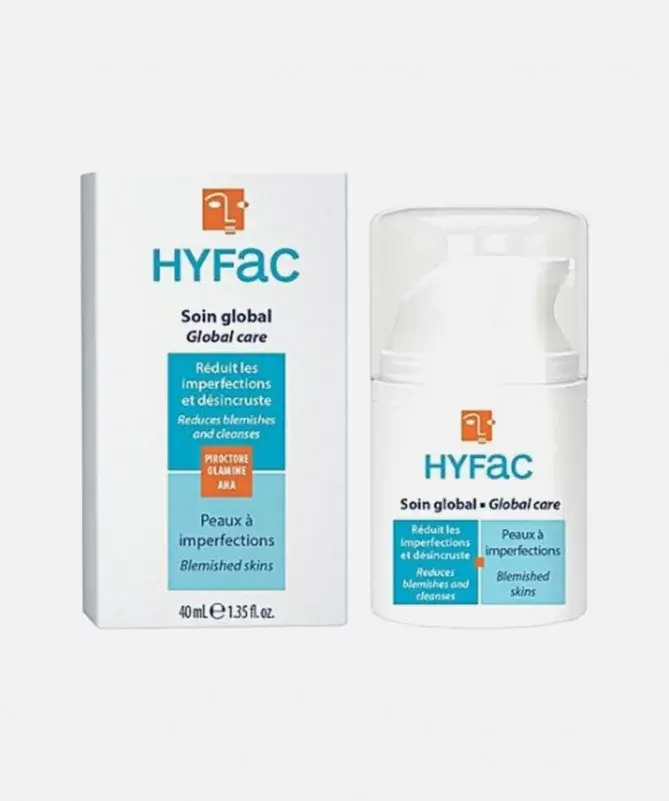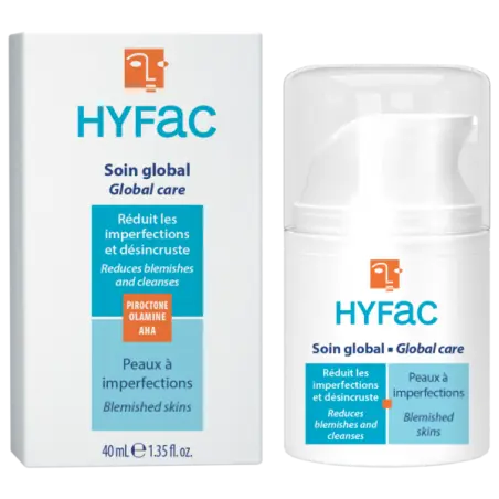 HYFAC Soin Global est le soin incontournable pour les peaux à imperfections. Sa formule innovante agit simultanément sur l’hydratation, la matité et la purification de la peau. Enrichi en actifs dermatologiques, il aide à limiter l’apparition des boutons tout en réduisant les marques résiduelles. Sa texture légère pénètre rapidement, sans laisser de film gras, pour un confort immédiat. Ce soin régule la production de sébum, affine le grain de peau et resserre les pores jour après jour. Les rougeurs sont atténuées, le teint retrouve éclat et uniformité. Parfait en base de maquillage, il convient à tous les types de peaux à tendance acnéique, même sensibles. Utilisez matin et soir sur une peau propre et sèche, en insistant sur les zones à imperfections. Pour des résultats optimaux, associez-le à une routine HYFAC complète. Offrez à votre visage une solution globale, efficace et respectueuse de votre peau.