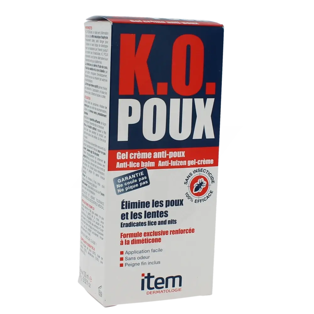 Découvrez ITEM K.O POUX GEL CR 100ML, la solution capillaire rapide et efficace contre les poux et les lentes. Sa formule innovante agit mécaniquement pour éliminer les parasites tout en respectant le cuir chevelu sensible de toute la famille. Sans insecticide chimique, ce gel convient aux adultes et aux enfants dès 3 ans. Sa texture crémeuse facilite l’application et assure une répartition homogène sur l’ensemble de la chevelure. En seulement quelques minutes, il asphyxie poux et lentes, limitant ainsi les risques de récidive. ITEM K.O POUX GEL CR n’agresse pas les cheveux et laisse une sensation de douceur après rinçage. Pratique, son flacon de 100 ml est idéal pour plusieurs applications. Pour une efficacité optimale, appliquez généreusement le gel sur cheveux secs, laissez agir selon les recommandations, puis peignez soigneusement avec un peigne fin. Faites confiance à la marque K.O pour retrouver rapidement des cheveux sains, propres et protégés. Adoptez ce geste essentiel pour toute la famille lors des périodes à risque !