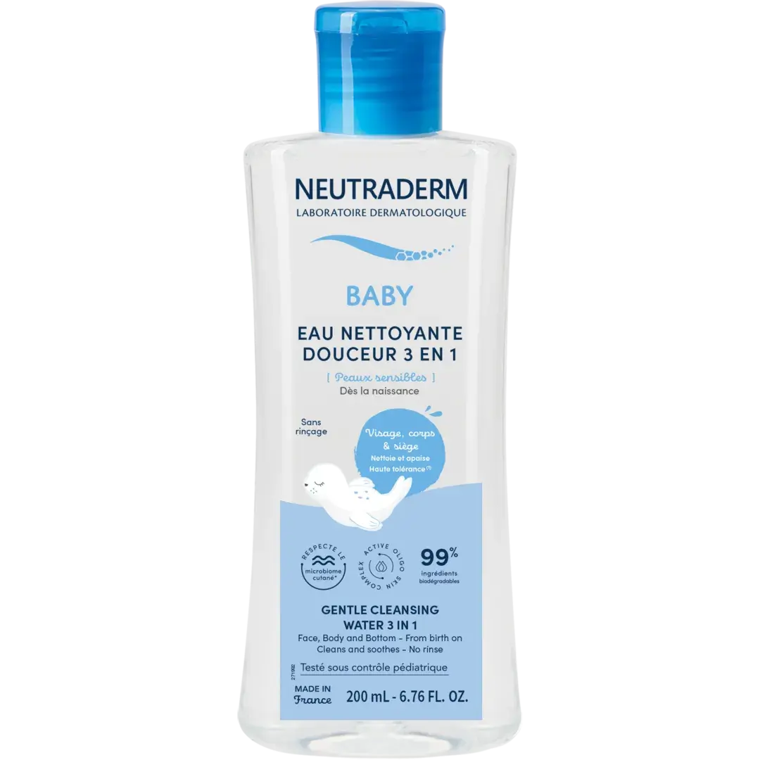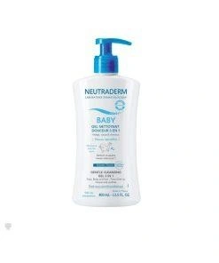 Le Gel Nettoyant Douceur 3en1 NEUTRADERM Baby offre une formule ultra-douce adaptée à la peau délicate des nourrissons et des jeunes enfants. Spécialement conçu pour le visage, le corps et les cheveux, il simplifie la routine de toilette tout en garantissant une tolérance optimale. Sa formule sans parfum et sans savon respecte l’équilibre cutané et prévient le dessèchement. Riche en actifs hydratants et apaisants, il nettoie efficacement sans irriter, même en cas de peau sensible ou atopique. Testé sous contrôle pédiatrique et dermatologique, il convient dès la naissance. Ce gel 3 en 1 mousse délicatement pour un rinçage facile, laissant la peau douce et les cheveux souples. Pratique et économique, il s’intègre parfaitement au quotidien des jeunes parents. Utilisez une petite quantité sur peau et cheveux mouillés, faites mousser puis rincez soigneusement. Offrez à votre bébé un moment de douceur et de protection à chaque bain avec NEUTRADERM Baby Gel Nettoyant Douceur 3en1.