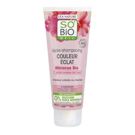 Découvrez le Shampooing Couleur Éclat à l’Hibiscus Bio de SO’BiO étic, spécialement conçu pour préserver et sublimer la beauté des cheveux colorés. Sa formule douce, à base d’hibiscus bio, protège l’intensité de la couleur tout en apportant brillance et vitalité à la chevelure. Enrichi en extraits naturels, ce shampooing nourrit la fibre capillaire et limite le dessèchement souvent causé par la coloration. Sa texture onctueuse nettoie délicatement sans agresser, pour des cheveux éclatants jour après jour. Les agents lavants d’origine végétale respectent l’équilibre du cuir chevelu, même sensible. Les cheveux retrouvent douceur, souplesse et légèreté, tout en conservant un éclat durable. Certifié bio, ce shampooing ne contient ni sulfates, ni silicones, ni parabènes, pour une routine capillaire saine et naturelle. Appliquez sur cheveux mouillés, massez délicatement puis rincez abondamment. Pour un résultat optimal, complétez avec l’après-shampooing de la même gamme. Préservez l’intensité de votre couleur, tout en profitant d’un parfum fleuri et délicat à chaque utilisation.