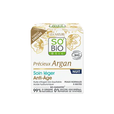 Le SOBIO Soin Léger Nuit Anti-Âge Argan 50ml est le secret d’une peau revitalisée au réveil. Sa formule enrichie en huile d’argan biologique nourrit intensément la peau tout en favorisant la régénération cellulaire durant la nuit. Grâce à sa texture légère et non grasse, ce soin convient parfaitement aux peaux matures désirant préserver leur éclat sans alourdir l’épiderme. Les rides et ridules sont visiblement atténuées, la peau retrouve souplesse et fermeté au fil des utilisations. L’action anti-âge de l’argan est renforcée par des actifs naturels qui stimulent la production de collagène, pour un teint plus lumineux et lisse. Son parfum délicat offre un véritable moment de détente avant le coucher. Appliquez chaque soir sur une peau propre et sèche, en massant délicatement le visage et le cou. Ce soin peut être utilisé seul ou en complément de votre routine anti-âge habituelle. Adapté aux peaux sensibles, il respecte l’équilibre naturel de la peau. Offrez-vous chaque nuit un soin d’exception pour une beauté préservée jour après jour.