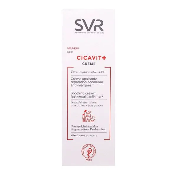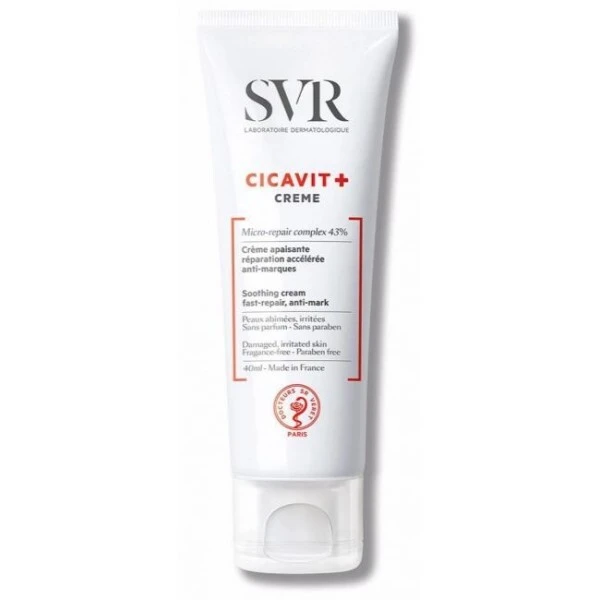 SVR Cicavit+ Crème Réparatrice 40ml est le soin incontournable pour les peaux fragilisées du visage. Sa formule enrichie en actifs réparateurs accélère la régénération cutanée, tout en apaisant immédiatement les sensations d’inconfort. Adaptée à toute la famille, elle agit efficacement sur les irritations, rougeurs, gerçures ou après des interventions dermatologiques. Grâce à sa texture légère et non grasse, elle pénètre rapidement et laisse la peau douce et protégée. Hypoallergénique et sans parfum, elle convient parfaitement aux peaux sensibles. Sa composition unique favorise la réparation de la barrière cutanée et limite les risques de marques ou cicatrices. Appliquez matin et soir sur une peau propre, en insistant sur les zones abîmées. Pour un résultat optimal, poursuivez l’utilisation jusqu’à complète réparation. Faites confiance à l’expertise SVR pour retrouver une peau saine, apaisée et confortable.