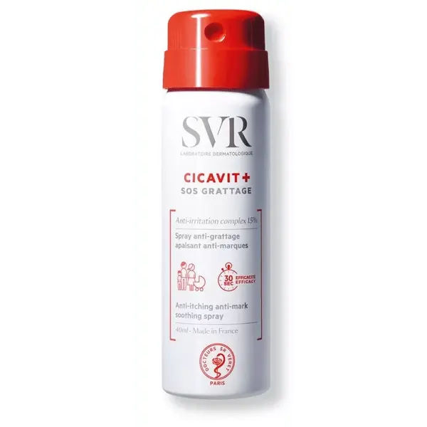 SVR CICAVIT SOS Grattage 40ml est le soin d’urgence idéal pour apaiser les sensations de grattage et les démangeaisons du corps. Sa formule haute tolérance, sans parfum ni conservateur, convient à toute la famille, même aux peaux sensibles ou atopiques. Grâce à sa texture légère et non grasse, il s’applique facilement et pénètre rapidement, procurant un soulagement immédiat. Enrichi en actifs réparateurs et anti-marques, il aide la peau à se régénérer tout en limitant les risques de cicatrices. Ce soin agit en synergie pour réduire l’envie de gratter et restaurer la barrière cutanée fragilisée. Adapté en cas d’irritations, d’eczéma, de piqûres ou après une intervention dermatologique, il s’utilise aussi bien chez l’adulte que chez l’enfant. Son format pratique de 40ml se glisse facilement dans un sac pour une utilisation à tout moment de la journée. Appliquez aussi souvent que nécessaire sur les zones concernées, en massant délicatement. Pour un apaisement durable, adoptez ce geste simple et efficace au quotidien. Offrez à votre peau un soin expert qui allie confort, sécurité et efficacité.