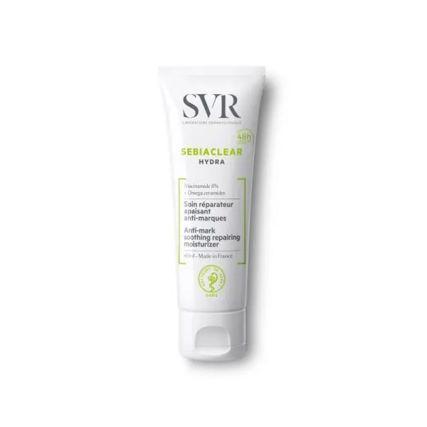 SVR SEBIACLEAR HYDRA 40ML est le soin incontournable des peaux fragilisées par les traitements anti-acné. Sa formule innovante apaise immédiatement les irritations, réduit les rougeurs et restaure la barrière cutanée grâce à sa haute concentration en actifs hydratants et réparateurs. Ultra confortable, sa texture non grasse pénètre rapidement sans laisser de film collant, pour une hydratation intense et durable. Enrichi en niacinamide et en sucres biomimétiques, ce soin favorise la cicatrisation et limite les marques résiduelles. Non comédogène, il convient parfaitement aux peaux mixtes à grasses sujettes aux imperfections. Testé sous contrôle dermatologique, il réduit efficacement les sensations de tiraillement et les inconforts liés à la sécheresse cutanée. Jour après jour, la peau retrouve souplesse, douceur et éclat. Appliquez matin et/ou soir sur une peau propre et sèche, en complément de votre routine anti-imperfections. Idéal en base de maquillage, il prépare la peau tout en la protégeant. Offrez à votre visage une hydratation experte signée SVR, pour une peau apaisée et rééquilibrée.