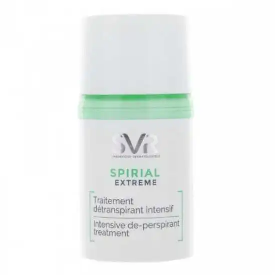 SVR Spirial Extrême 20ml est un détranspirant intensif conçu pour réguler efficacement la transpiration excessive, même dans les situations les plus extrêmes. Sa formule haute tolérance, sans alcool et sans parfum, respecte les peaux sensibles tout en garantissant une efficacité longue durée. Grâce à sa concentration optimale en actifs anti-transpirants, il offre une protection jusqu’à 48 heures contre l’humidité et les odeurs. Ce soin discret et facile à appliquer s’adresse aussi bien aux femmes qu’aux hommes confrontés à une transpiration abondante, notamment au niveau des aisselles, mains ou pieds. Sa texture fluide pénètre rapidement sans laisser de traces sur la peau ou les vêtements. Hypoallergénique, il minimise les risques d’irritation et convient parfaitement à un usage quotidien ou ponctuel, selon vos besoins. Spirial Extrême s’utilise sur une peau propre et sèche, de préférence le soir, pour une efficacité optimale. Appliquez une fine couche sur les zones concernées, puis espacez progressivement les applications dès amélioration. Profitez d’une sensation de fraîcheur et de confiance, tout au long de la journée. Adoptez SVR Spirial Extrême pour un contrôle total de la transpiration et un confort durable.