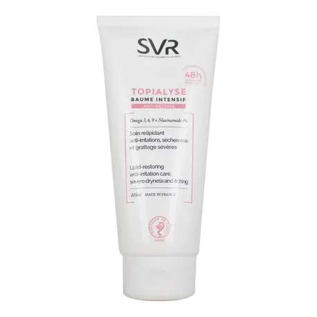 SVR Topialyse Baume Intensif 200ml est le soin quotidien incontournable des peaux très sèches, atopiques ou sujettes aux démangeaisons. Sa formule haute tolérance, sans parfum ni conservateur, associe des omégas 3, 6, 9 et du beurre de karité pour restaurer la barrière cutanée et apaiser durablement l’inconfort. Dès la première application, les sensations de tiraillements et de grattage sont réduites, laissant la peau intensément nourrie et protégée. Sa texture fondante, non grasse, pénètre rapidement pour un habillage immédiat. Idéal pour toute la famille, y compris les nourrissons, il calme les irritations et limite les pics de sécheresse. Hypoallergénique et testé dermatologiquement, il respecte les peaux les plus fragiles. Utilisez-le matin et/ou soir sur peau propre, en massant délicatement sur l’ensemble du corps. Insistez sur les zones sèches pour un confort optimal. Offrez à votre peau une sensation de douceur et de soulagement durable avec Topialyse Baume Intensif de SVR. Adoptez ce geste expert pour retrouver une peau apaisée, souple et protégée jour après jour.