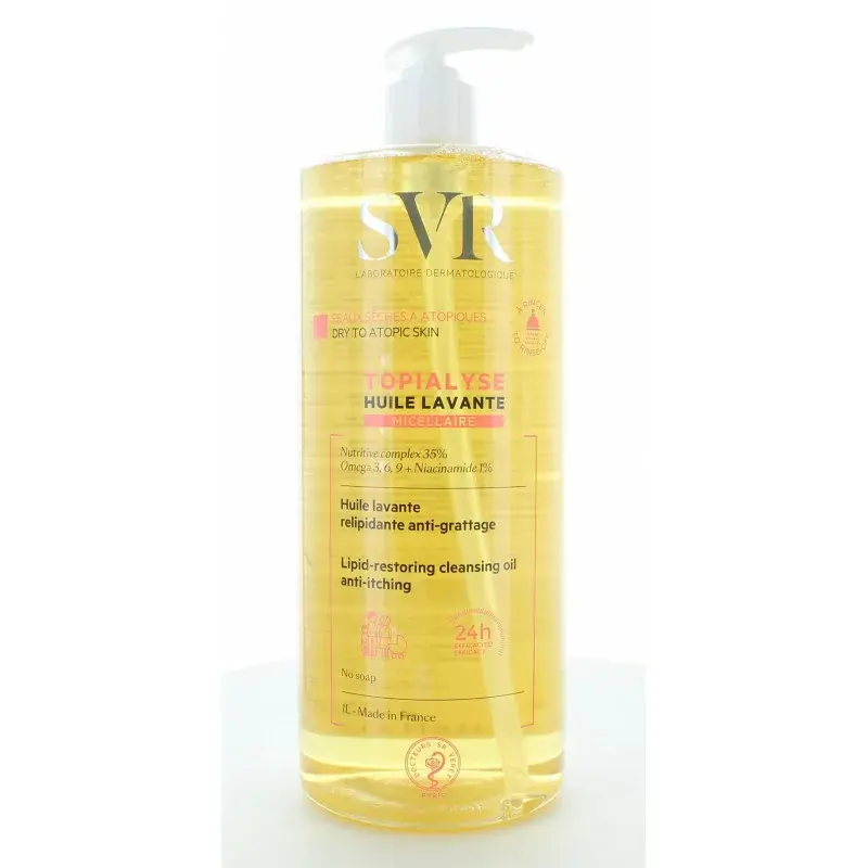 Découvrez SVR Topialyse Huile Lavante Micellaire 1L, le soin d’hygiène idéal pour toute la famille. Enrichie en omégas 3, 6 et 9, cette huile lavante nettoie en douceur tout en préservant la barrière cutanée. Sa formule haute tolérance apaise les sensations de tiraillement et protège la peau du dessèchement. Sans savon, sans sulfate et sans parfum, elle convient parfaitement aux peaux sèches, très sèches ou à tendance atopique, même les plus sensibles. Sa texture soyeuse se transforme en une mousse délicate, facile à rincer, laissant la peau souple et confortable. Utilisée quotidiennement, elle réduit les démangeaisons et renforce la protection naturelle de la peau. Testée dermatologiquement, elle est adaptée aux bébés dès la naissance, enfants et adultes. Pratique, son format familial d’un litre accompagne toute la famille pour une hydratation longue durée. Utilisez-la sous la douche ou dans le bain, puis rincez délicatement. Offrez à votre peau une expérience sensorielle et protectrice avec l’huile lavante SVR Topialyse.