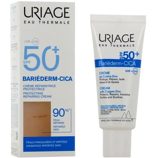 Découvrez la Bariederm Cica-Crème SPF50+ d’Uriage, votre alliée quotidienne pour réparer, protéger et apaiser les peaux fragilisées. Grâce à sa formule enrichie en Poly-2P, le complexe breveté d’Uriage, cette crème favorise la restauration de la barrière cutanée tout en offrant une protection solaire très haute SPF50+. Elle convient parfaitement aux peaux agressées par le soleil, les irritations ou les traitements dermatologiques. Sa texture non grasse et résistante à l’eau pénètre rapidement sans laisser de film blanc, pour un confort optimal au quotidien. Enrichie en eau thermale d’Uriage, elle calme immédiatement les sensations d’inconfort et réduit les risques de marques et de cicatrices. Elle est idéale pour protéger les zones exposées du corps et du visage, tout en prévenant l’hyperpigmentation post-lésionnelle. Testée sous contrôle dermatologique, elle convient à toute la famille, même aux peaux sensibles. Appliquez généreusement sur les zones concernées avant toute exposition au soleil, puis renouvelez fréquemment, surtout après la baignade ou la transpiration. Offrez à votre peau une réparation optimale et une haute protection avec la Bariederm Cica-Crème SPF50+ d’Uriage.